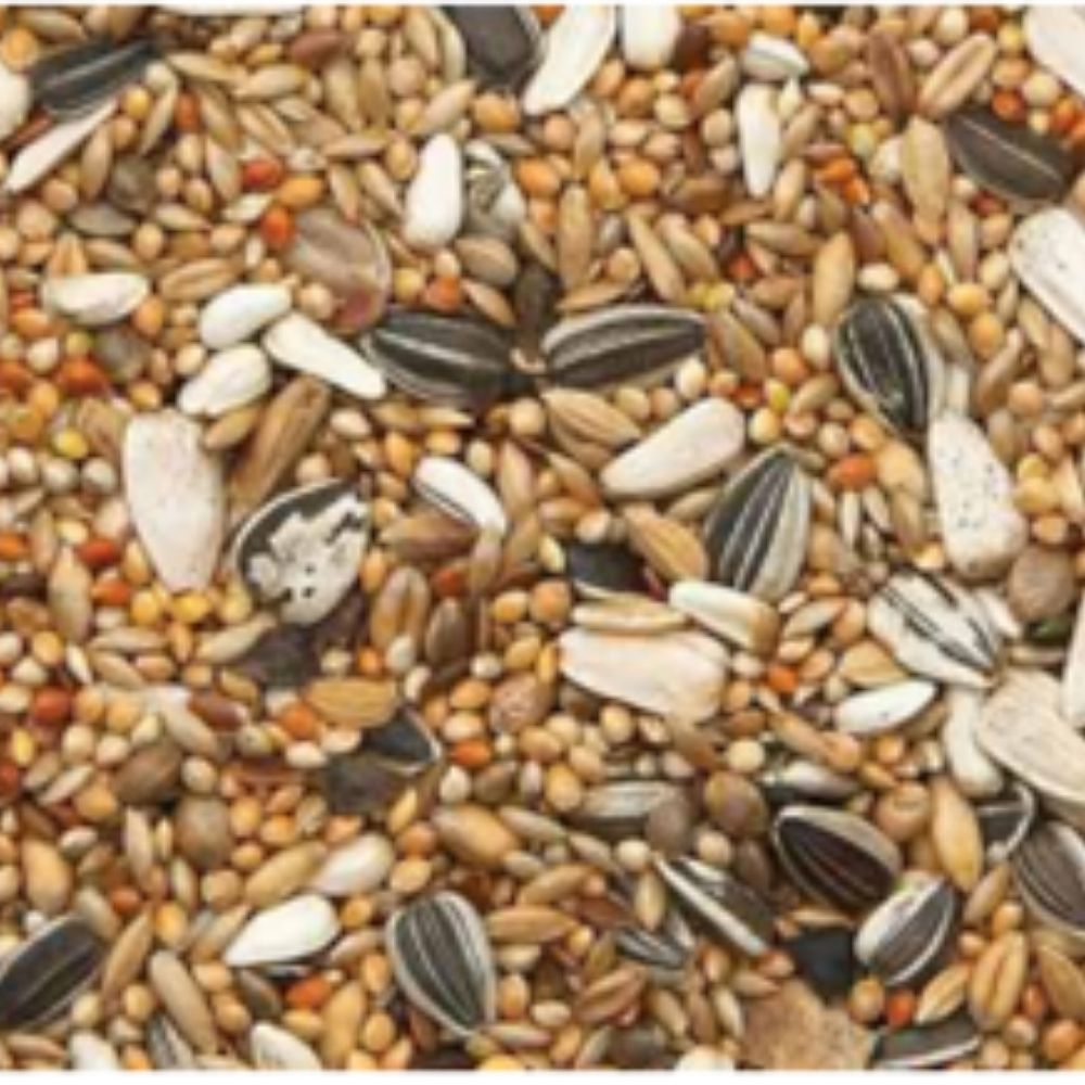 Zusammensetzung: Kanariensaat 13%,Hirse gelb 21%, Weizen hell 12,5%, Hirse weiß 11,5%, Sonnenblum. gestreift 8%, Haferkerne 9%, Kardy weiß 6%, Hirse rot 4%, Sonnenblum. weiß 4% Leinsaat 3%, Hanfsaat 3%, Paddy Reis 2,5%, Buchweizen 2,5%