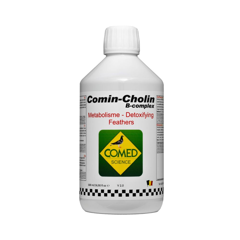 Comin-Cholin B-complex ist eine Lösung von Aminosäuren, Elektrolyten, Vitaminen, Sorbitol, Methionin und Cholin. Es wird verwendet zur Kräftigung und Unterstützung bei allen Stresssituationen. Insbesondere empfehlenswert bei eiweissreichen Diäten (grosse Belastung der Leber). Empfehlenswert bei Transport und Ausstellungen und als Sauberung vor der Zucht. Es hat auch einen guten Einfluss auf die Federqualität.