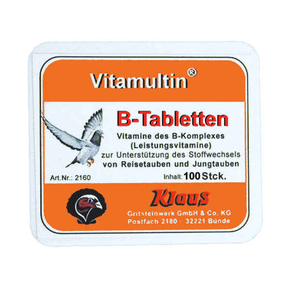 Vitamultin® B-Komplex-Tabl. Sie enthält die Vitamine B1,B2,B6,B12, Calciumpantothenat, Folsäure, Nicotinamid und Biotin. Diese Vitamine sind die Leistungs-Vitamine. Die Tablette ist besonders zur Einzelbehandlung der Reisetauben und der heranwachsenden Jungtauben geeignet. Der Wirkungsbereich ist mit dem vorgenannten flüssigen Vitamultin B-Komplex identisch.
