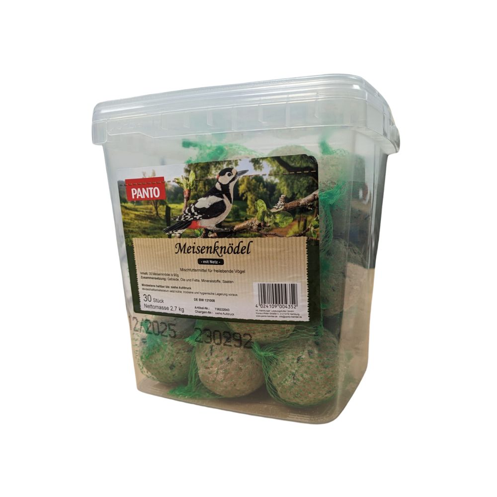 Der Panto Meisenknödel ist mit seiner Allroundmischung aus Getreideflocken, Sonnenblumenkernen und einem hohen Fettanteil der Klassiker und meistverkaufte Knödel unseres Sortiments. Die handlichen Knödel mit Netz lassen sich bequem an jedem Futterplatz sowohl im Garten als auch auf dem Balkon anbringen.