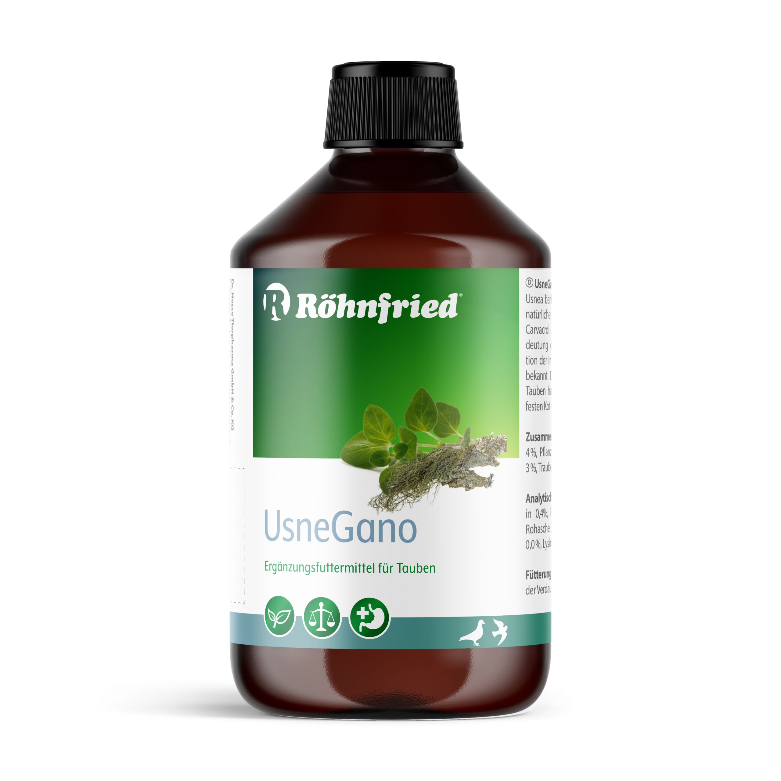 Fütterungsempfehlung: Zur Förderung der Verdauung täglich, ansonsten 2- bis 3-mal pro Woche 3 ml/Liter Trinkwasser. Zucht, Aufzucht und Mauser: 2-3-mal pro Woche. Reisetauben: 1-2 Tage nach dem Wettflug, 2 Tage vor dem Einsatztag. UsneGano kann auch mit Avidress Plus, Carni-Speed und Entrobac in einer Tränke gemischt verabreicht werden.